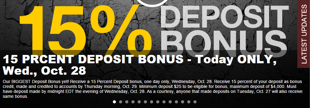 We’re offering a 15 PERCENT Deposit Bonus TODAY ONLY, Wednesday, Oct. 28. Receive 15 percent of your deposit as bonus credit, made overnight by 8:00 a.m. on Thursday, Oct. 29. Minimum deposit $25 to be eligible for bonus, maximum deposit of $4,000.