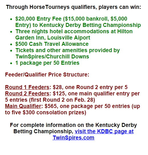 Kentucky Derby Betting Championship Qualifiers Now Available Posted on February 24, 2016 by McKay Share this: Click to share on X (Opens in new window) X Click to share on Facebook (Opens in new window) Facebook Like Loading... Related