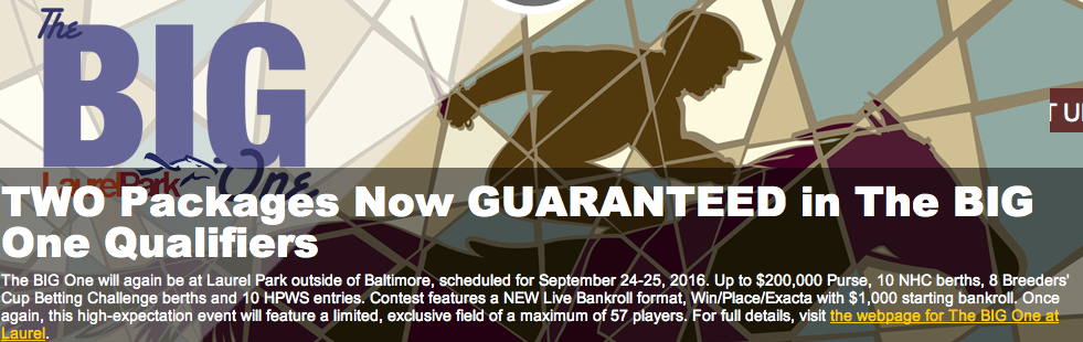 Sunday is your next opportunity to win one of the exclusive seats available to The Big One on September 24-25 at Laurel. (There will be no more than 57 competitors at The Big One.) There are a plethora of ways to be part of the next The Big One qualifier: You can buy directly in on Sunday for $478. Or for $106, you could buy in to our Saturday (7/16) Round 2 feeder where one out of every five entries will advance. Or you could play in one of our numerous The Big One feeders this week where you could win a seat in the Round 2 feeder for $24 or directly into the Sunday qualifier for $53. It may be The Big One. But you certainly don’t need a “Big” budget to take your shot at winning a seat.