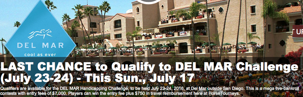 Time is running out to qualify for the July 23-24 Del Mar Handicapping Challenge. Want in to the $7,000 mega-live-bankroll event? Then be sure to play in our Last Chance Del Mar qualifier this Sunday, July 17. You can win a seat + $750 in travel for just $360 in our Sunday qualifier, and we have low-cost feeders running every day ahead of July 17 for $40. Sign up now for your chance at entry into a lucrative tournament hosted in a terrific setting.