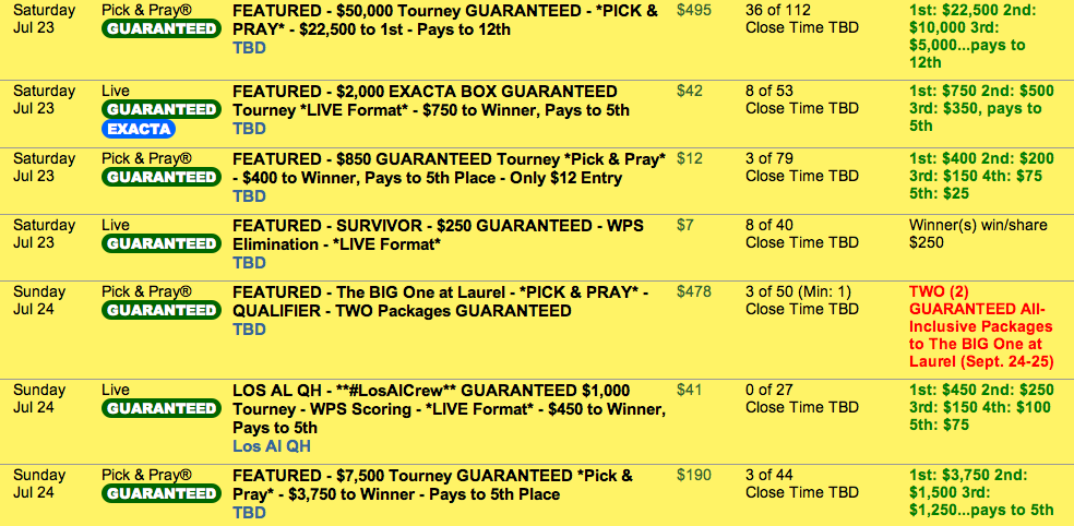 Sunday is another big day. Our gavel-to-gavel coverage includes two guaranteed packages to The BIG One (including $106 direct feeders leading up to Sunday); the Wynn Blowout — which will grant a Wynn entry to one of every 10 players; the first-ever qualifier to the August 20 Indiana Grand tourney (with each HorseTourneys qualifier receiving TWO entries); two-day packages to the highly popular Battle of Saratoga (8/10-11) and Hawthorne Summer tourney (8/13-14); as well as a $7,500 guaranteed cash contest with $3,750 to the winner. Here’s a look at this weekend’s top guaranteed tourneys: