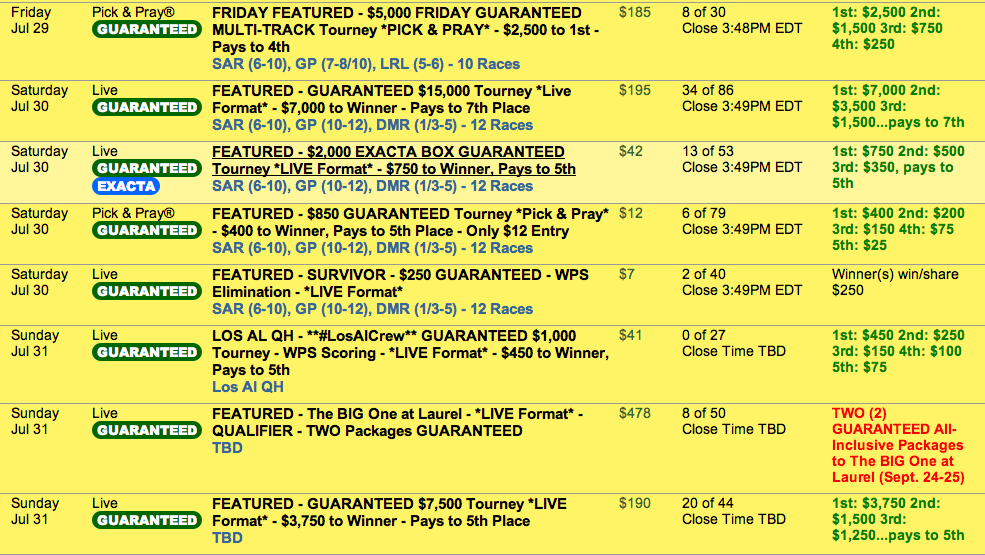 We’re also hosting a pair of very worthwhile guaranteed cash games on Saturday. One is our $15,000 Guaranteed game and the other is our $2,000 Guaranteed exacta box games where you pick a three-horse exacta box for each race play. Both of these contests ran as nice overlays (especially the exacta box game) last week, so value hawks should definitely want to mark these down on their Saturday to-do lists.