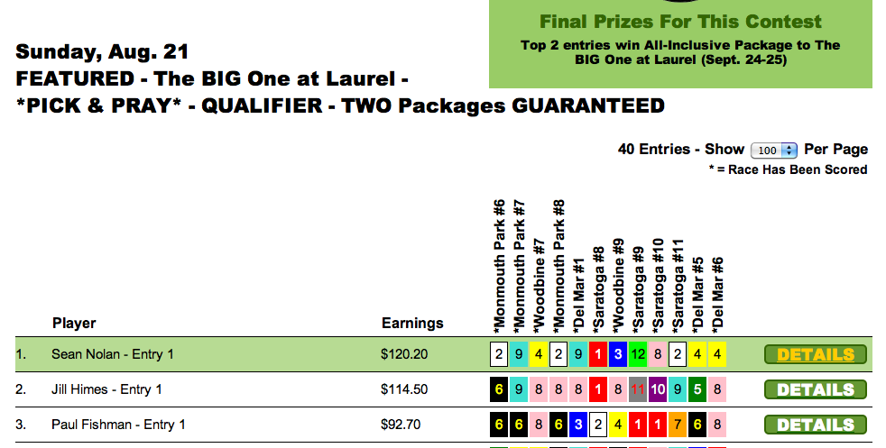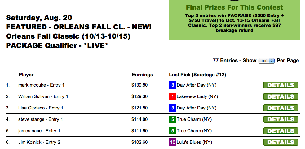 In our $1,500 Guaranteed Exacta Box game, winner Stephen McNatton totally whiffed on Camp Creek. But these exacta box games are a different animal, and here it was McNatton’s $83.50 exacta (for $1) on the first contest race (MTH R6) that did the major damage en route to his victory, which was worth $600.
