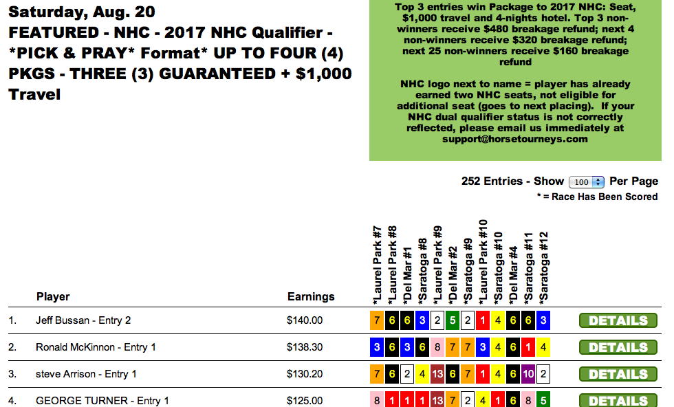 John Jones (above at Laurel winning a stakes first off the claim) and Souper Knight (Del Mar) were the stars on Saturday. And they helped make stars out of several HorseTourneys competitors. Jeff Bussan, Ronald McKinnon and Steve Arrison missed on John Jones but they all had Souper Knight, and that was enought to propel them to full NHC packages in Saturday’s big qualifier.