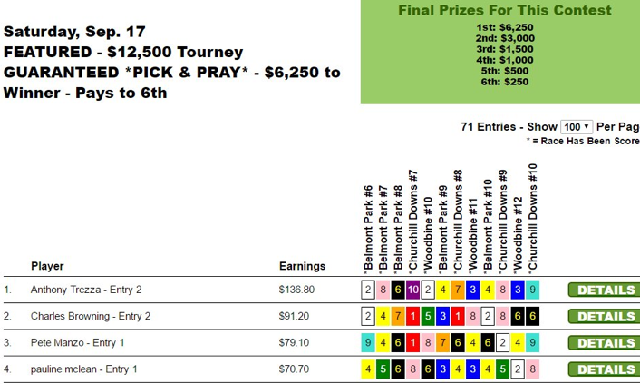 In other high-end qualifiers on Sunday, Jim Klein ($134.50) and Bill O’Neal ($122.80) won $3,500 packages to next month’s Keeneland NHC/BCBC Challenge. And Pete Acocella ($96.60) took top honors in winning a $4,500 package to November’s Del Mar Fall Classic.