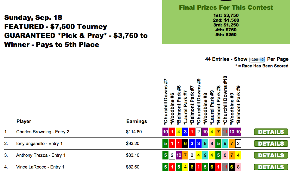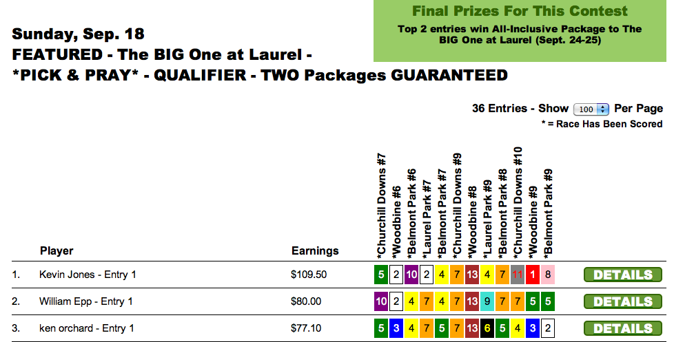 Thanks to all of our participants in last weekend’s tourneys, and good luck in all of your contest endeavors this week. We’ll be bringing you updates here and on Twitter live from The BIG One at Laurel this weekend.