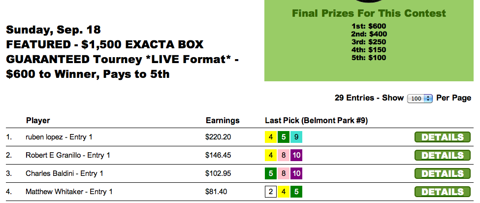 Before we move on to the rest of Sunday, kudos to Ben Clayton and Anthony Garafalo who each won full packages to the Orleans Fall Classic on Saturday…and to Peter Milburn and Howard Welsh won won $1,500 entries into next year’s Horse Player World Series.