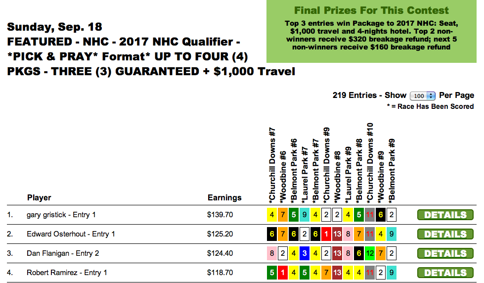 Scores were high in Sunday’s 3-seat Guaranteed NHC qualifier. Congratulations to Gary Gristick ($139.70), Edward Osterhout ($125.20) and Dan Flanigan ($124.20) who finished at the top of the heap and all punched their tickets to the big dance.