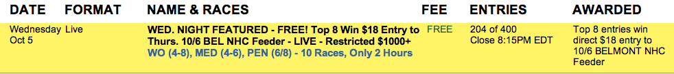 Someone gleefully commented to me last month that she had won an NHC seat at HorseTourneys for just $18 by winning a feeder, then winning the direct qualifier that followed. This week you don’t even need the 18 bucks. If you have played at least $1,000 lifetime at HorseTourneys, you can win an NHC seat for free by finishing in the top 8 of tonight’s free contest…