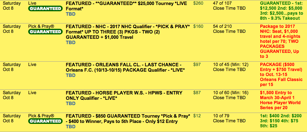 Saturday is also your last chance to qualify for next weekend’s Orleans Fall Classic. Entries cost $97 and one entry per every 15 will win a $500 entry plus $750 for travel. If that tourney is coming up too quickly for your liking, you can also try for a $1,500, 2017 Horse Player World Series (also at The Orleans) entry for $87. One in 20 will win. Here’s an at-a-glance view of our top Saturday tourneys: