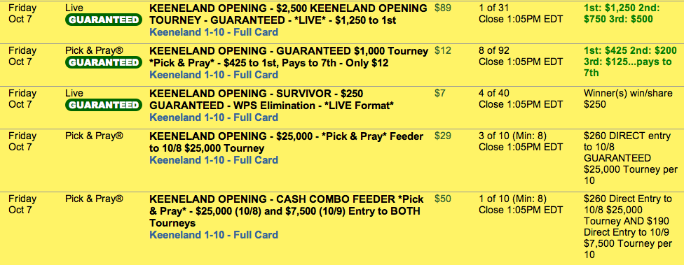 It’s not just a great weekend of Breeders’ Cup prep races. Opening Day at Keeneland is Friday and we’re ready for it here at HorseTourneys. We’ll be hosting 24 full-card, Keeneland-only tourneys on Friday (including three guaranteed cash games) with prices ranging from $5-$110 so that you can jump right in to what is always an exciting meet each fall. Here are just a handful of them:
