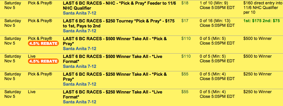 There will be five-person, All-Optional tourneys (again picking 7 of 12 races) with 4% rebates offering winner-take-all prizes of $500 with just five players allowed. Plus live and Pick & Pray winner-take-all games encompassing all 12 races at the $250, $500 and $1,500 prize levels.