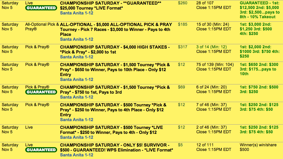 We, of course, have that $25,000 guaranteed game on Saturday for $260 with $12,500 to the winner and prizes down to 8th place. We’ve also got a creative $5,000 All-Optional tourney where you pay an $85 entry fee and play seven of the 12 Santa Anita races on Saturday. So you can cherry pick your best plays or skip the first five and save all of your bullets for the end.