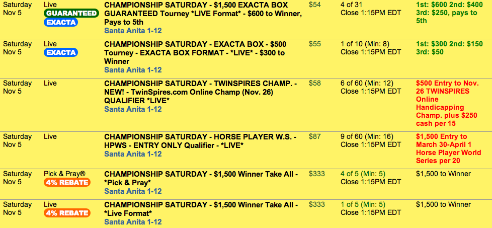 For seat hunters, there are two big direct qualifiers Saturday – one for the Horse Player World Series ($87, one winner per 20) and one for the Twin Spires Online Championships ($58, one per 15).