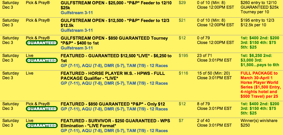 Also note, though, that Saturday is opening day at Gulfstream, which means it’s Claiming Crown Day, which annually means plenty of wide-open, juicy betting races with horses shipping from all over. As a result, we will offer a wide array of tourneys Saturday that focus solely on the 3rd through 11th races on the Gulfstream card.