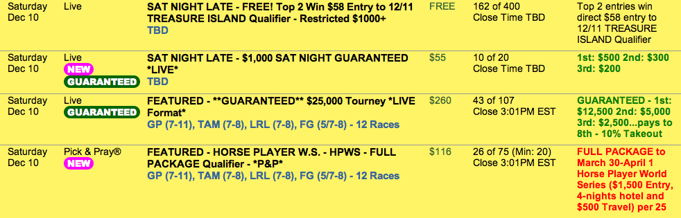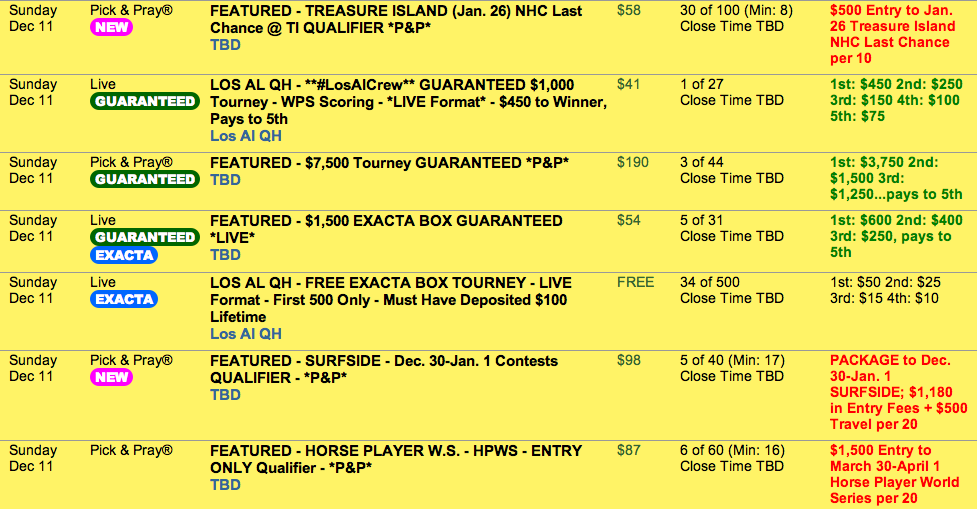 We have two other featured direct qualifiers slated for Sunday. One is for the Surfside tourneys on Dec. 30- Jan. 1. Entries here cost $98 with one in 20 winning $1,180 in entry fees (enough for all three days) plus $500 travel. The other is our entry-only Horse Player World Series qualifier with one in 20 (at $87/entry) winning a $1,500 entry to the 2017 HPWS.