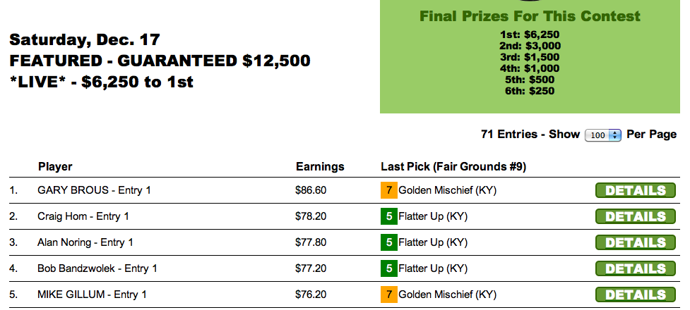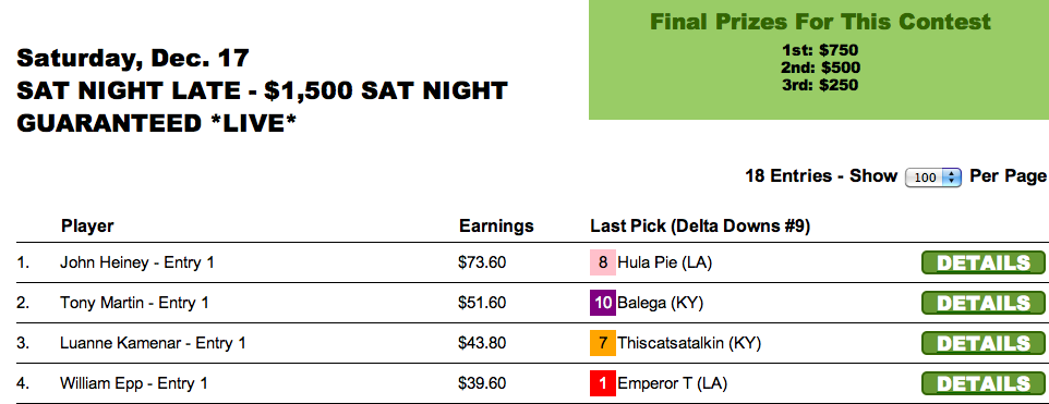 John Heiney amassed the best 9-race tally to take the $750 top prize. Note that this tourney was a strong overlay event for the player with only 18 entries at $69 each. Keep that in mind the next time you see a guaranteed Saturday night tourney – or any guaranteed tourney, for that matter.