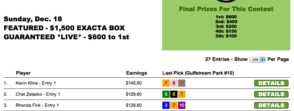 Our $1,500 guaranteed Exacta box tourney went to Kevin Kline, whose two $1 exacta winners came from opposite ends of the spectrum.