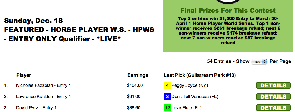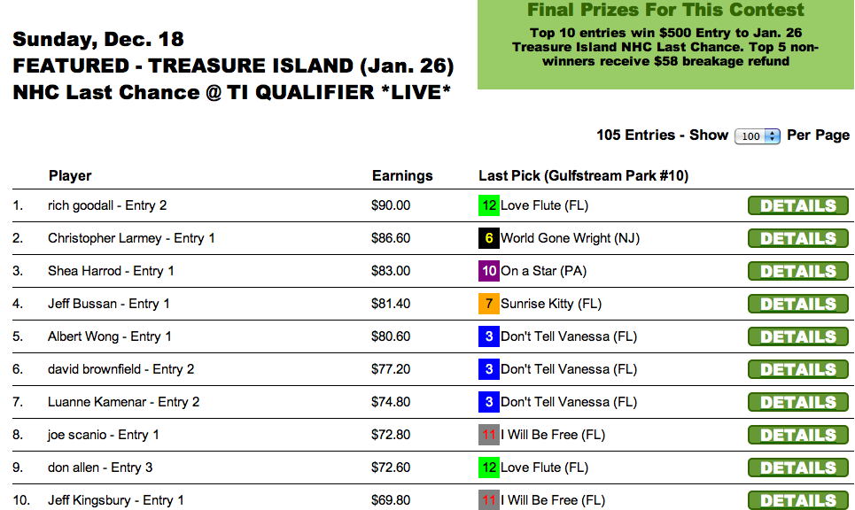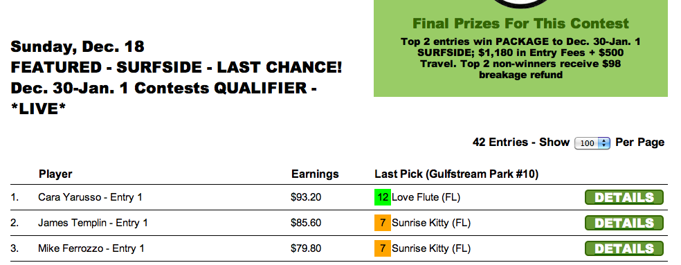 When cap horse Love Flute ($42.00 to win, $22.00 to place for tourney purposes) won Gulfstream’s 10th race, the final race of our abbreviated featured tourneys, it rocketed Cara Yarusso to the top of the heap in our Last Chance Surfside qualifier. Yarusso will be representing HorseTourneys there along with Jim Templin who managed to finish “in the money” despite not having Love Flute.