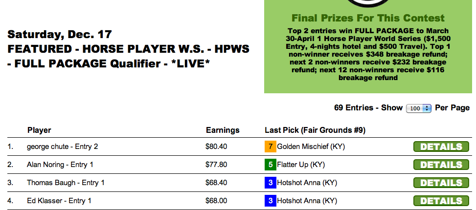 On November 26, in another Horse Player World Series full-package qualifier, the highest-priced winner was $17.80. All Chute did that day was to pick the $17.80 horse and another seven winners in addition to that. Eight out of twelve in all.