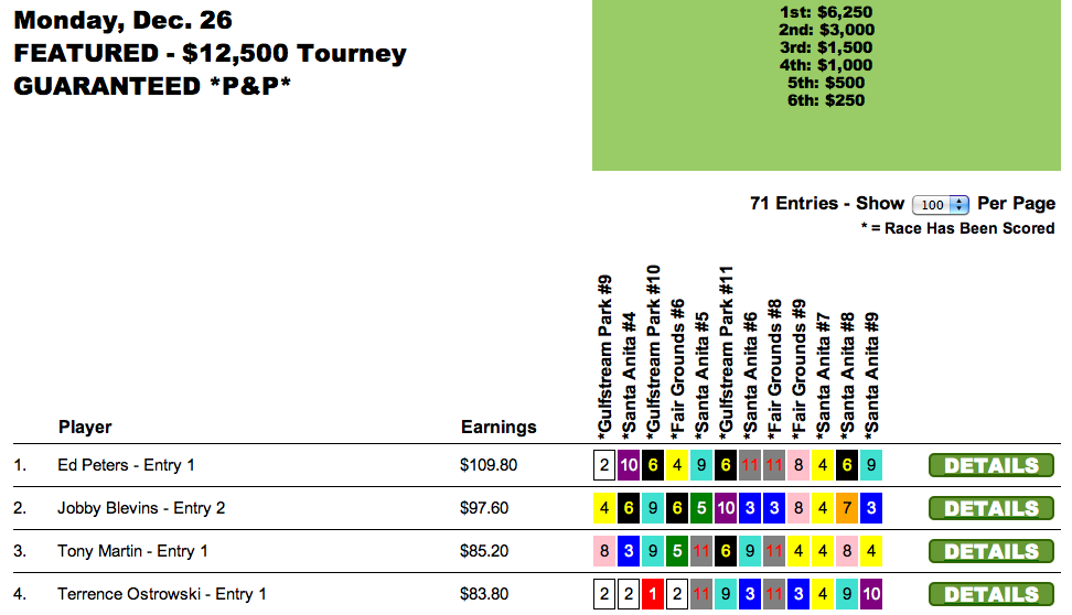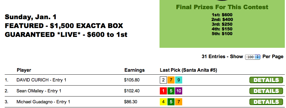 Meanwhile, our Sunday $1,500 Guaranteed Exacta Box tourney was won in vastly different style this week. Our recent winners seemed to all be hitting one huge race that resulted in them finishing with two or three times the totals of their nearest opponent. Not so on Sunday.