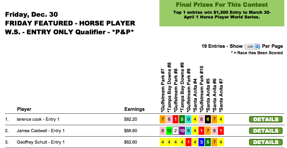 Tony Nevill at Treasure Island reports that, due to a flurry of recent betting action, Cook is now the strong 5-2 future book favorite to annex the Friday, January 6 Horse Player World Series Entry Only tourney here. Horses for courses.
