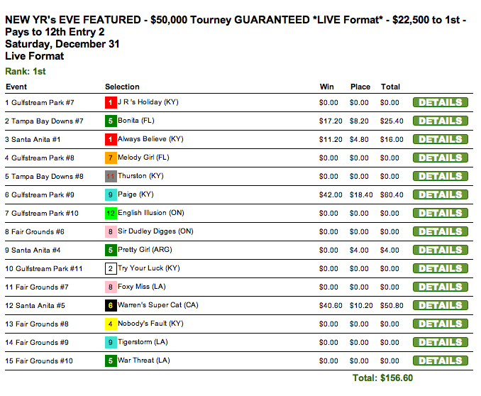 What was the difference for David Curich? The 10th race at Tampa where Curich hit the $1 exacta that paid a whopping… $4.80… and edged him past runner up Sean O’Malley. Who said that 3-5 shots (the win odds of the Tampa winner) can’t help you in contests?!