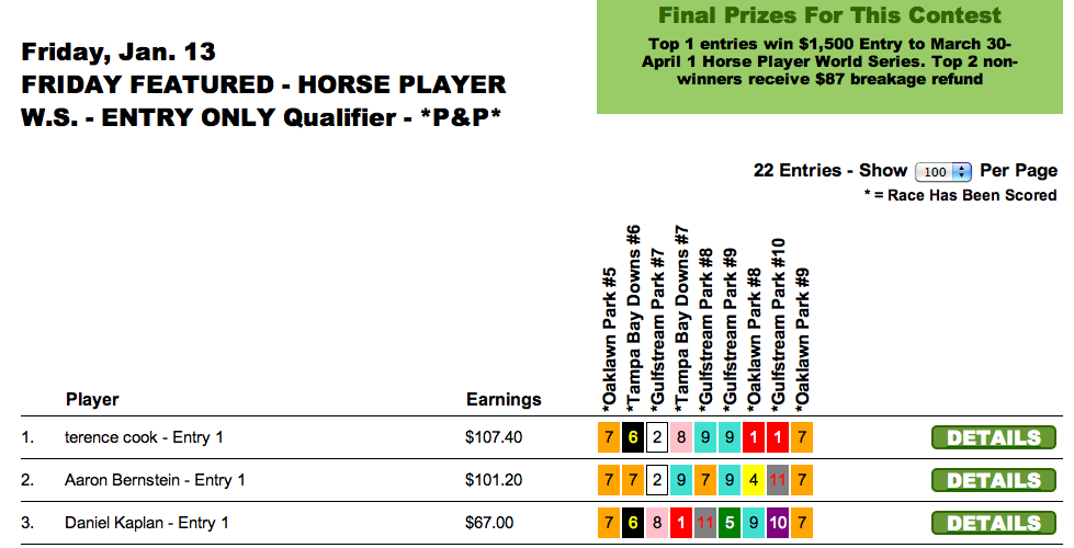 …Terence Cook won our Friday Horse Player World Series Entry Only tourney. He wasn’t in the money three times, he didn’t win a seat three times, he finished first three times.