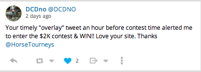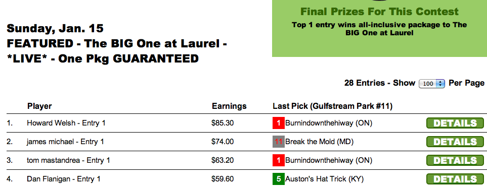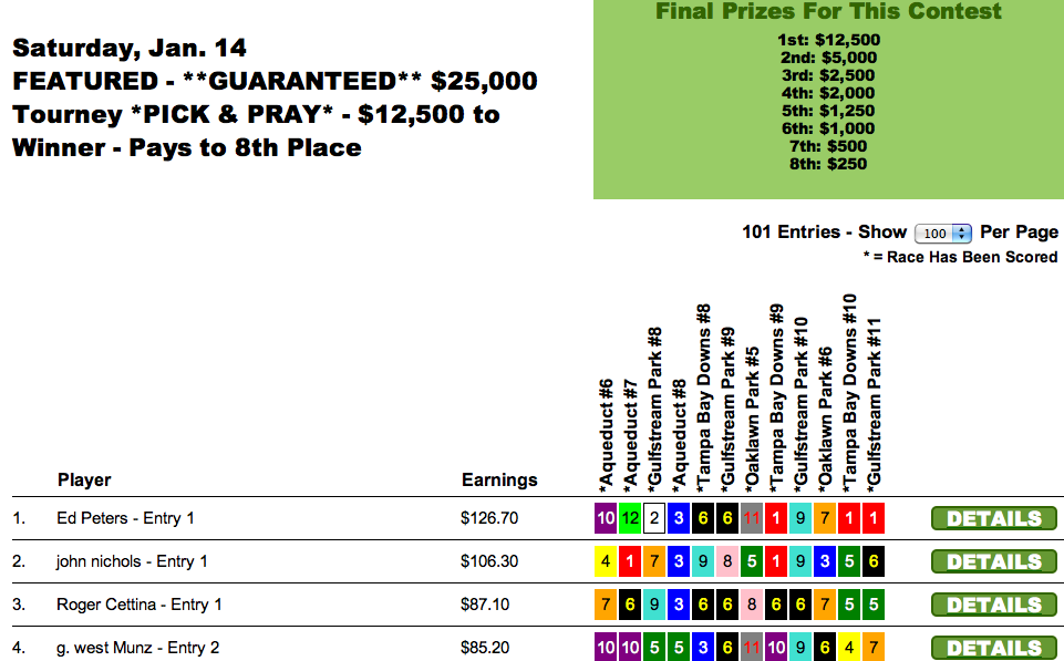 When Tero won the 10th at Gulfstream as a cap horse, many HorseTourneys players had him—and that’s all they had, making $64.00 a very popular final score for the day. As a result, we had to invoke tiebreakers for many of our tourneys and when players have picked the exact same scoring horses (in this case, horse…as in singular), you quickly burn through a bunch of tiebreaker parameters. With the case of the single-casher $64.00 scorers, we had to drill down to tiebreaker #5, which was most number of third-place finishers. These show horses determined a whole bunch of outcomes on Friday, including some of our featured-tourney prizes.