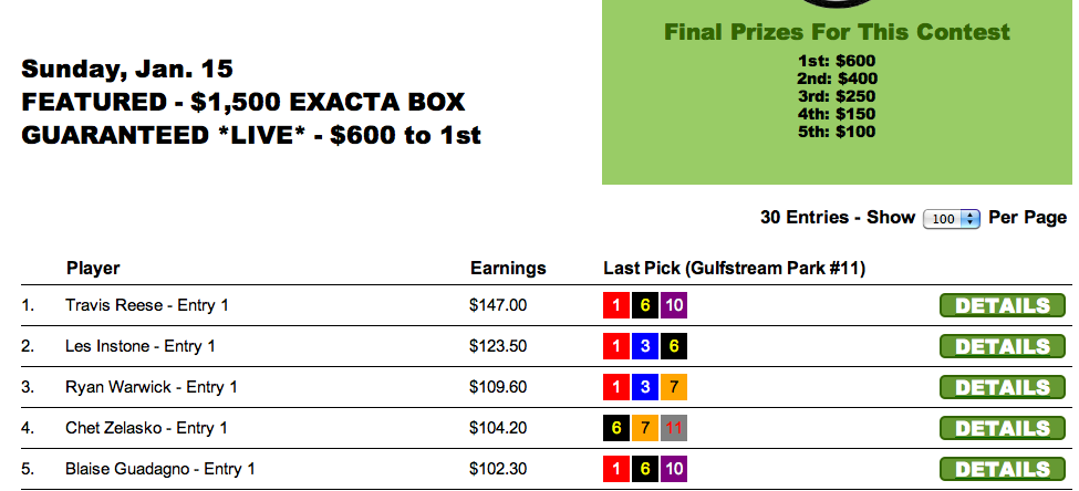 …he also won our $1,500 Guaranteed Exacta Box tourney that day, hitting four exactas (a rather gaudy number based on recent history) to complete his unique “double”. Clearly Travis was seeing the ball very well on Sunday. Well done!