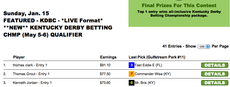 (It should be noted that after we began taking entries and running feeders for this qualifier, Churchill Downs announced that the entry fee for its KDBC would be dropped to $12,000 ($8,000 bankroll + $4,000 entry) from the previous $20,000. So what we did was pay the difference ($8,000) to Thomas as an added prize. Going forward, we have adjusted our entry fees accordingly downward on KDBC qualifiers.)