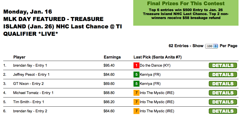 This makes a total of 91 entries to the Treasure Island Last Chance competition won at HorseTourneys thus far. We thank you for your incredible support of these contests. Note that your last opportunity to win a seat hear for that NHC Last Chancer is Saturday, January 21. Let’s see if we can get to 100.