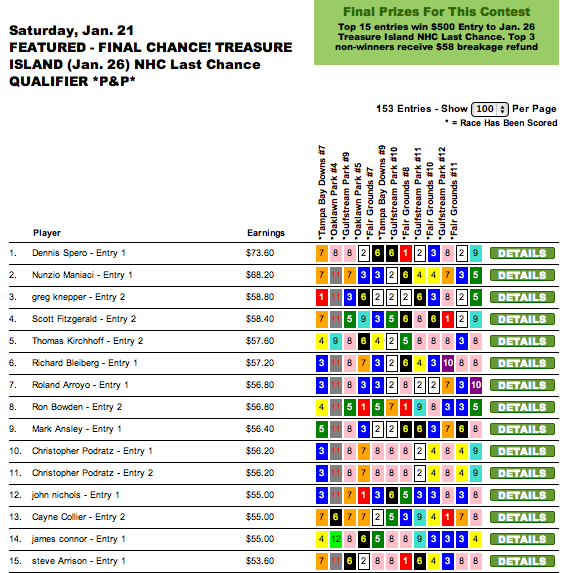 That’s because the $73.60 he tallied in our final Treasure Island NHC First Chance/Last Chance qualifier represented the highest score posted by anyone in our Saturday or Sunday featured tourneys. Dennis was one of 15 First Chance/Last Chance winners that day and, for the record, there was a remarkable total of 112 entries won to this event during the several weeks we ran qualifiers. We wish them—and all of the many HorseTourneys NHC qualifiers the best of luck this week in Las Vegas.