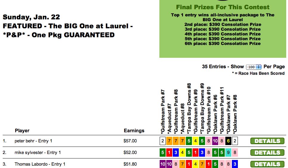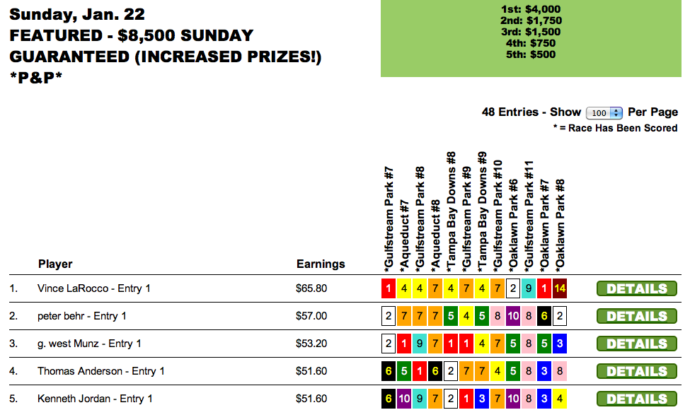 Michael Cennerazzo only registered two wins and three places—good for $68.00–on his 12-race scoresheet for Saturday’s $15,000 Guaranteed event. What was that worth? The first prize of $7,000! Rick Broth cashed for $3,500 as the runner up with a score of $65.20.
