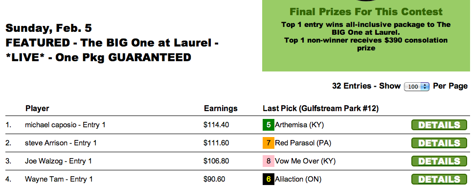 Congratulations to all of this weekend’s winners and thanks to all for playing. Next weekend might even be even more exciting with a 3-seat (at least) NHC qualifier and our first qualifier to The Stronach Group Ultimate Handicapping Challenge both added to the schedule. Hope to see you there.