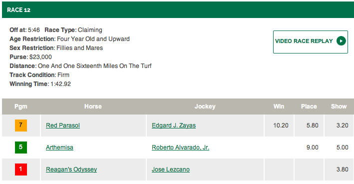 The answer for Arrison was “No.” He collected $16.00 for the combined win and place…but Caposio’s solid $9.00 place payoff on Arthemisa allowed Caposio to lose the battle yet still win the war.