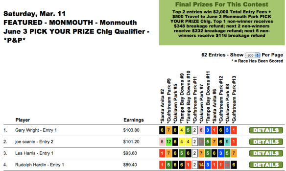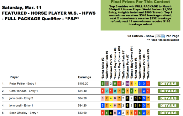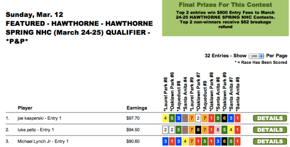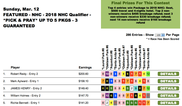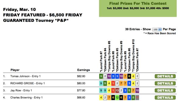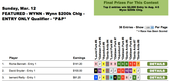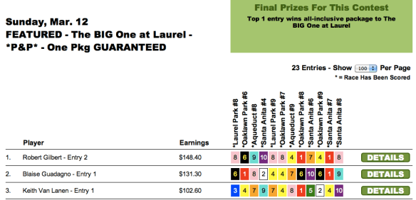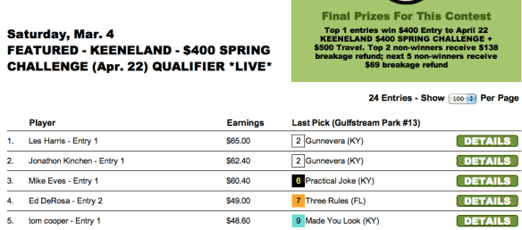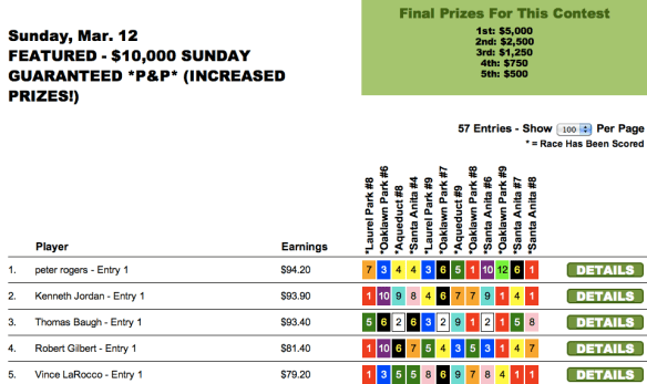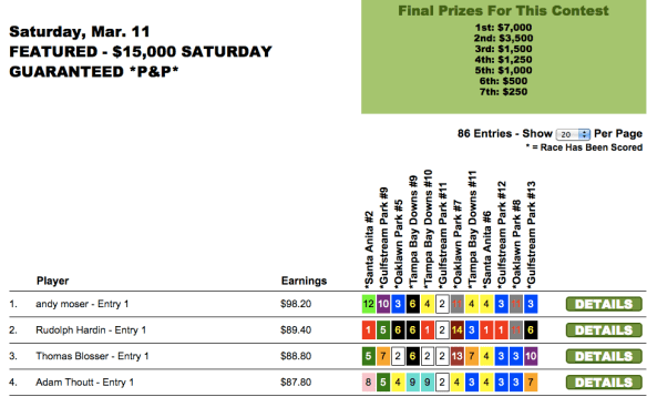 Sunday’s newly-enhanced $10,000 game went to Peter Rogers ($5,000), who edged out Kenneth Jordan ($2,500) by just 30 cents. (Jordan was knocking on the door of several tourneys all weekend long, including the TSG Ultimate Betting Championship where he finished a fine 6th behind Moomey–good for an NHC seat and more than $16,000). It was only another 50 cents back to Thomas Baugh ($1,250) in 3rd. Rogers and Jordan each had the $8.00 place horse in the contest finale to squeeze past Baugh.