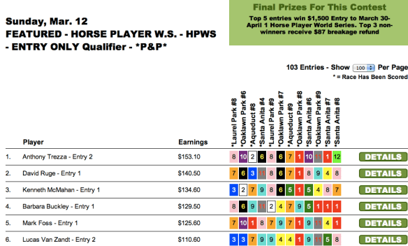 1. HorseTourney – the great horseplayer friendly sight. Kudos for the “round ups”. Congrats to all the winners……especially Sally Wang Goodall and Barb Buckley. Great representatives for all horseplayers but especially Distaffers!