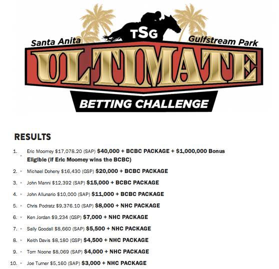 Before we zero in on all the excitement within our site, however, we want to lead things off by recognizing the tremendous weekend exploits of Eric Moomey, who won Saturday’s The Stronach Group Ultimate Betting Challenge, after qualifying for the event (twice) at HorseTourneys.