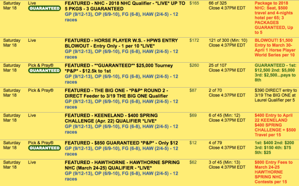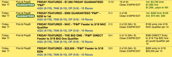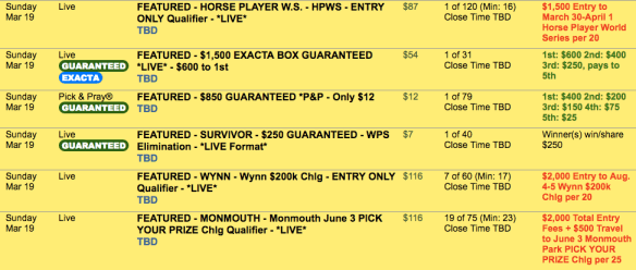 As usual, we will be offering a slew of low-cost feeders where you can earn you way in to many of the big Saturday/Sunday tournaments—including some taking place next weekend (March 25-26). One of those March 25 qualifiers for which we’ve already begun offering feeders is our first 2017 Treasure Island Wager to Win qualifier. One in 25 entries on March 25 will win $1,000 entries to both days of the May 19-20 (Preakness weekend) tourneys at Treasure Island, plus $500 for travel. So keep that in mind for this weekend.