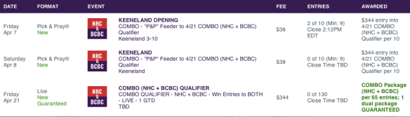 Not only that, starting Friday, April 7, you can play low-cost feeders where you can win your way into that highly-desirable April 21 combo competition. Imagine qualifying for both the NHC and BCBC for just $38!