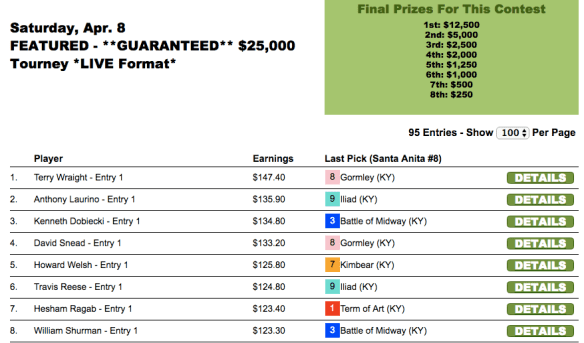 Congratulations to Terry Wraight for earning the $12,500 top prize in what was a 12-race, all-stakes competition. Key to his success were the longshots Irap (Toyota Blue Grass) and Green Gratto (Carter), along with mid-priced Santa Anita Derby winner Gormley.