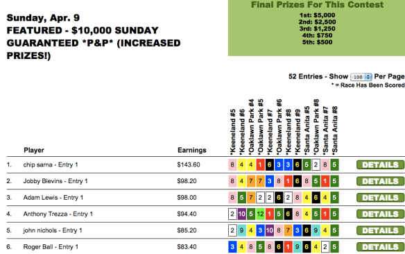 Cherokee Dynasty (total $2 win/place contest payout of $61.20) in Santa Anita’s 8th races was instrumental in their wins (as was the case for most who won on Sunday).