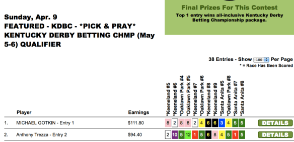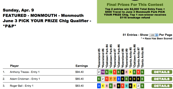 Since Moomey was already going to be at Keeneland for the Spring Challenge on the 22nd, it would only make sense for him to go ahead and win a $3,000 entry into the following day’s Keeneland Grade One Gamble. So that’s what he did. Our other Keeneland Grade One Gamble winner was another familiar name—former Breeders’ Cup Betting Challenge winner Tommy Massis, who is as dangerous as they come in a live-bankroll competition like Keeneland’s.