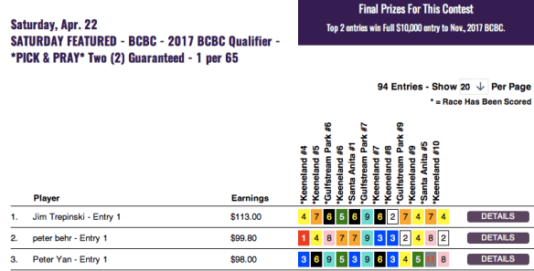 While his namesake was busy filling it up for the Utah Jazz against the L.A. Clippers, our Joe Johnson was scoring points of his own—most notably with Padilla ($17.80 to win) in the contest finale, the 10th at Gulfstream. Joe’s buzzer-beater heroics vaulted him into first place over a hard-luck Charles Grubbs in our first NHC-BCBC Combo Qualifier over at HorsePlayers. In one contest, Johnson checked off two of the most coveted boxes on any contest player’s wishlist. Our next NHC-BCBC double qualifier at HorsePlayers? Friday, May 5…Kentucky Oaks Day. See you there!