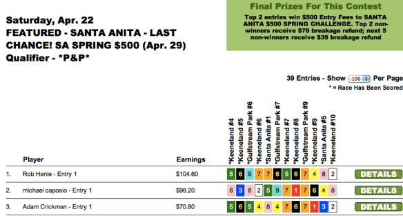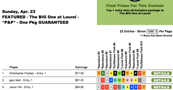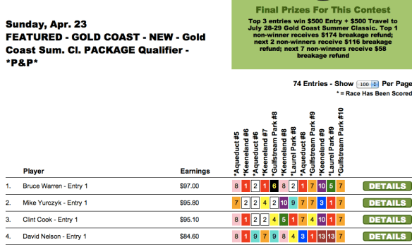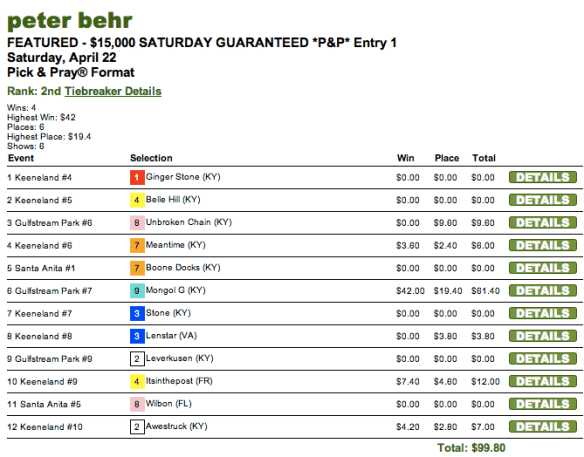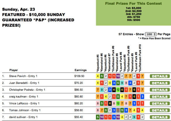 Saturday was an interesting Pick & Pray day. In recent weeks, we’ve seen such players as Bill Roth and Darryl Lacy run roughshod over a day’s menu with a single set of on-point selections. Saturday was sort of like that, but not exactly. What we had were four names that showed up over-and-over at the top of the leaderboards.