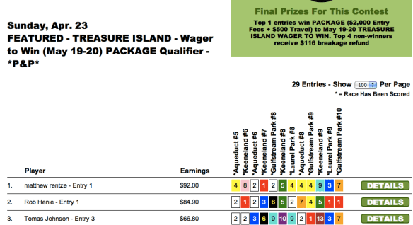 In Saturday’s Treasure Island Wager to Win qualifier, Matthew Rentze finished on top with a score of $86.80 to win the $2,500 package.