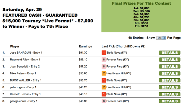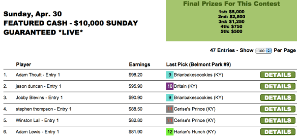 In fact, he only had six common plays among the same set of 12 contest races—making Cettina’s results all the more impressive given how easy it can be to split winners across two tickets and wind up with two nice but out-of-the-money scores. Among the six non-common plays on each of his tickets, Cettina had a different 11-1 winner on each and a different second-pace finisher on each. Theoretically, he could have registered a much gaudier final score had he loaded those 11-1 shots onto the same entry. But then he perhaps would have won only one of the two tourneys. So Cettina, not surprisingly, played his tickets to an optimal final result and, in the process, won his way in to the two most prestigious events on the tournament calendar.
