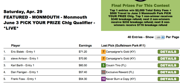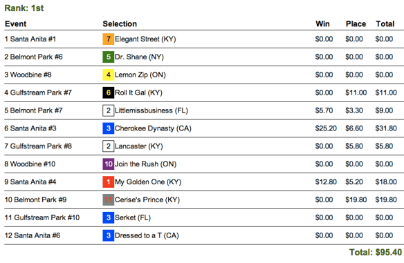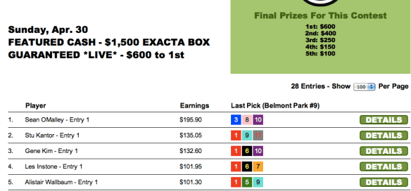 His entire score of $195.90 was earned on the strength of a single, winning $1 exacta…on the 8th race at Tampa. This easily bested Stu Kantor who had four winning exactas and Gene Kim who had five. Alas, sometimes slow and steady only gets you second or third place.