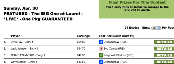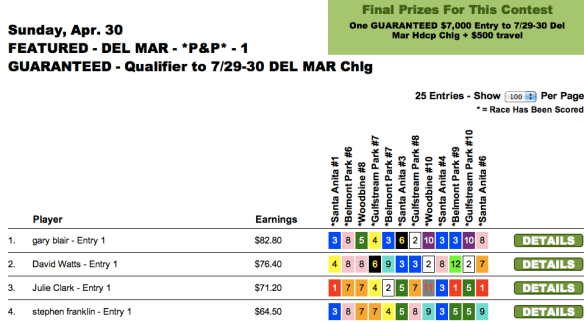 His pick of Evo Campo ($8.60 to win, $5.00 to place) moved him from 3rd to 1st place and earned him the $7,500 package. Blair is also now eligible for the HorseTourneys-Del Mar bonus. If Blair wins at Del Mar, he receives a $10,000 HorseTourneys site credit bonus, payable over six months. That would be a gift that keeps on giving!